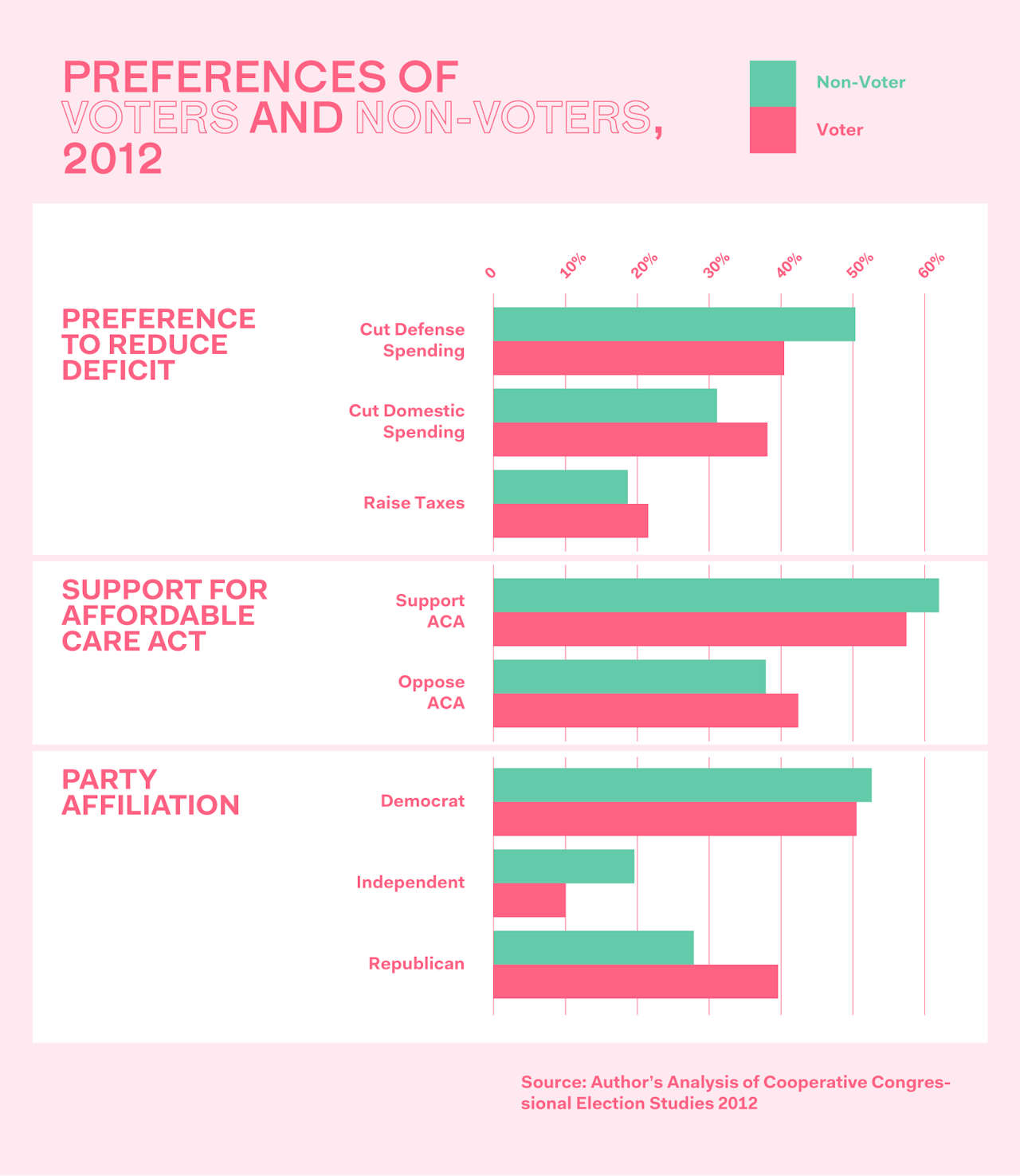 In the 2016 election, black voter turnout was down from 2012 while white turnout increased — certainly enthusiasm could have played a role, but 2016 is also the first presidential election since a key provision of the Voting Rights Act was struck down (which required states with a history of voting rights violations to get pre-clearance before changing their voting laws). Many formerly covered states aggressively restricted voting rights and closed polling locations. While some of these restrictions were stopped in courts, the lack of pre-clearance meant that many were implemented. Political scientist Anthony Fowler found that lower turnout benefits Republicans, and my own research shows that non-voters have more progressive views than voters.