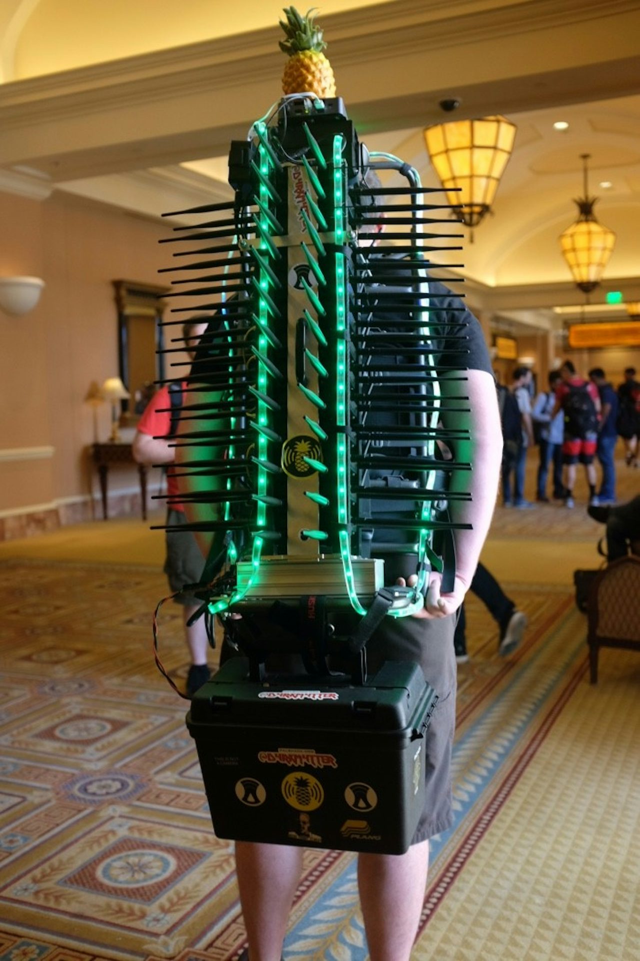 Mike Spicer, an independent security researcher who goes by the handle d4rkm4tter, couldn’t walk five feet at the Las Vegas hacker convention DEF CON last weekend without being stopped by people gawking and asking questions. That’s because he was wearing a 30-lb. backpack made of a stack of 50 radios and decorated with blue and green LED lights. “Hashtag #wificactus,” he told people as he walked through Caesar’s Palace, where the convention was held. “Get it trending.”