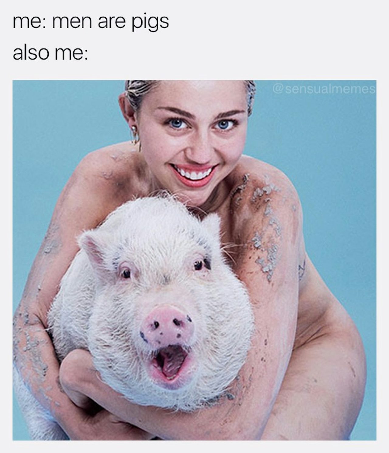 This is another example of using low-hanging fruit — i.e. a picture of Miley Cyrus cuddling a pig — to get a simple point across. I consider this a silly, light, and pointed meme. For most feminists who are attracted to men, privilege is an ongoing struggle within romantic relationships. Resenting a person for not understanding the privilege they inherently possess while simultaneously being in love with them sucks, and the obstacles this creates can be impossible to overcome.