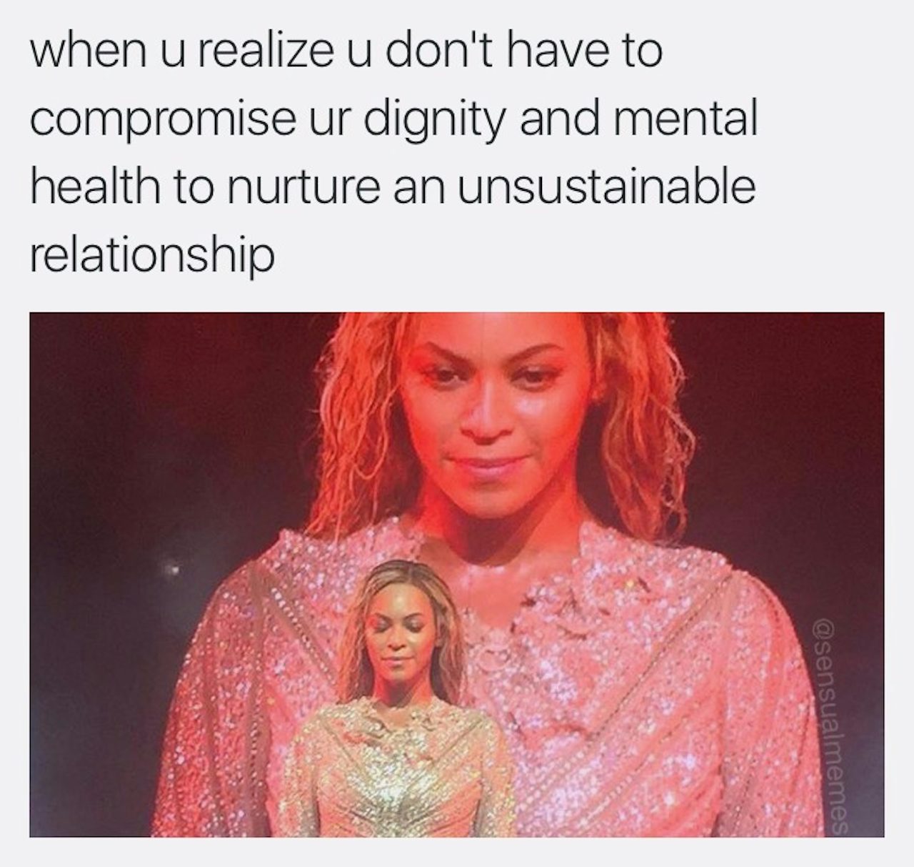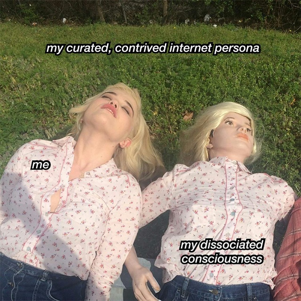 Some people wonder: Are memes art? I think that context and intention is everything. The internet is a wonderful platform for art because of how accessible it is, but at the same time it inflates the value of that medium. I make most of my memes when I’m slumped over on my couch, glaring at my phone. Other times I will be ruminating for days on something that’s bothering me about society or my relationships, and I’m able to articulate my feelings via a meme in a succinct moment of catharsis. My process involves a mixture of boredom and a-ha moments. Here are some of my favorite memes I’ve made, and a bit on the inspiration behind them.