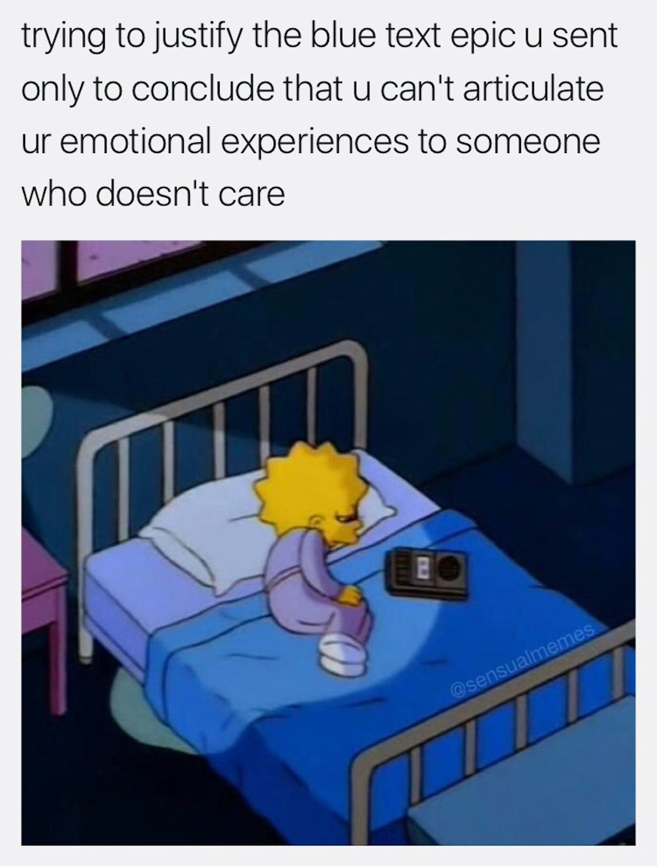 My close friends often send me images they think I could make memes from, and this excerpt from The Simpsons is a keen example. It’s nice because they know my niche sense of humor, and I can usually come up with a corresponding caption. I made this meme to address the hypocrisy of fake male allies and nice-guy culture.