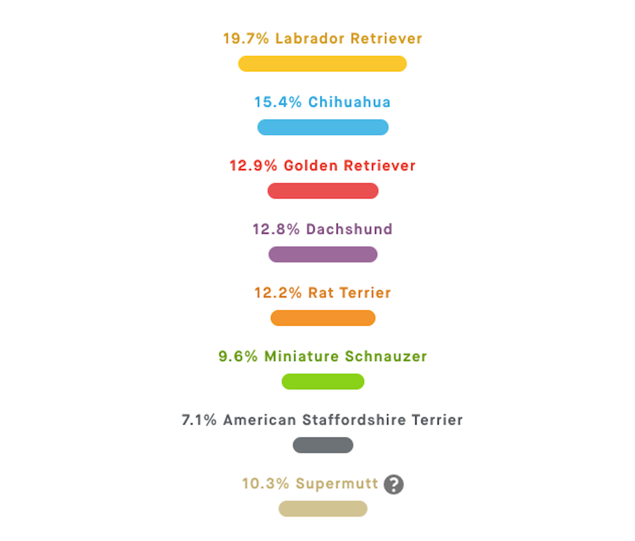 He is, as you can see, so many things. Peter. (A “supermutt” means, according to Embark, that there may be “small amounts of DNA from these distant ancestors”: Chow Chow, Dalmatian, and Miniature Pinscher.) Here he is. The basic structure of a Labrador Retriever. The smaller stature of a Chihuahua. The intelligent, calm demeanor of a Golden Retriever. The love for burrowing of the small-prey hunter dachshund. The wide-set eyes and expressive ears of a rat terrier. The sociability of the Miniature Schnauzer. The wide chest and slightly bowed back legs of the American Staffordshire terrier. The spotted tongue of the Chow Chow.