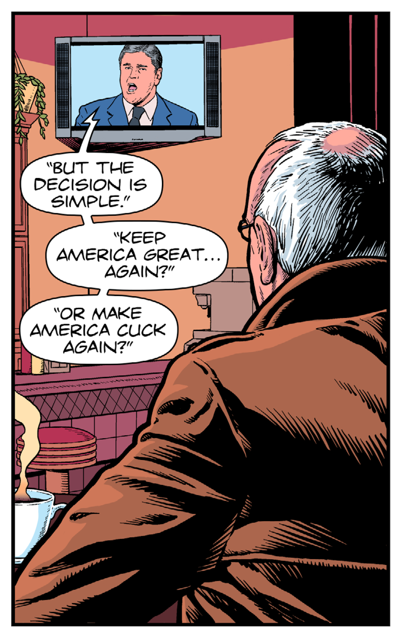 Last year, we launched Who Watches the Men, a comic about Trump’s America styled after Alan Moore and Dave Gibbons’ iconic Watchmen series. After a long hiatus, we’re bringing the comic back, with a new installment coming every other week. We pick up in the 12th year of Trump’s presidency, and finally, new elections are being held. The forces seeking to shape the future of this country gather in silence, waiting for their moment...