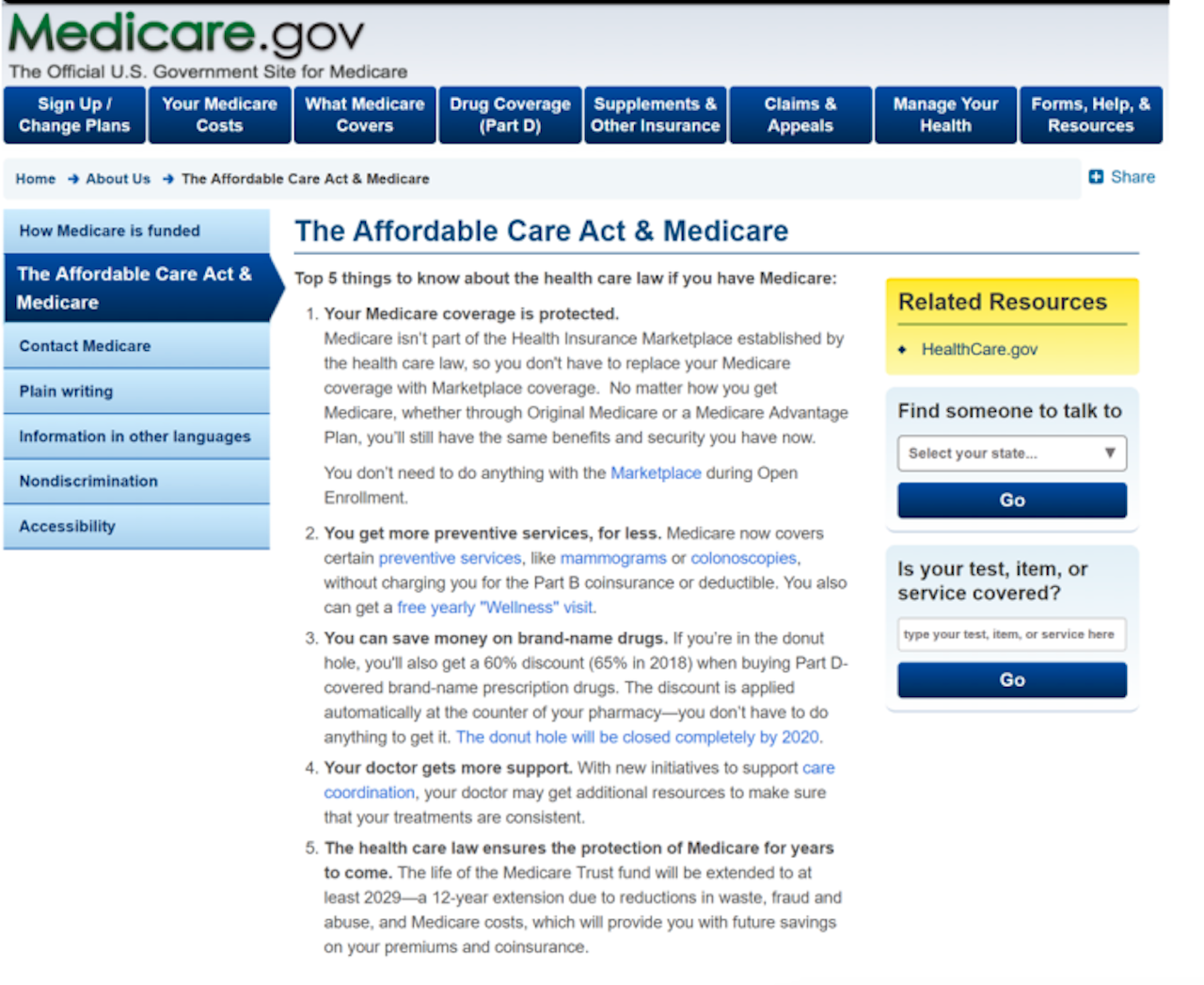 The removed page, the report said, “included information and links related to Medicare coverage being protected under the health care law, preventive services covered under Medicare, discounts on brand-name prescription drugs, and initiatives that support care coordination between provider.” Additionally, links to “The Affordable Care Act & Medicare” were removed from other pages on the Medicare website, including its “About” page and another called “Medicare & the Marketplace.”