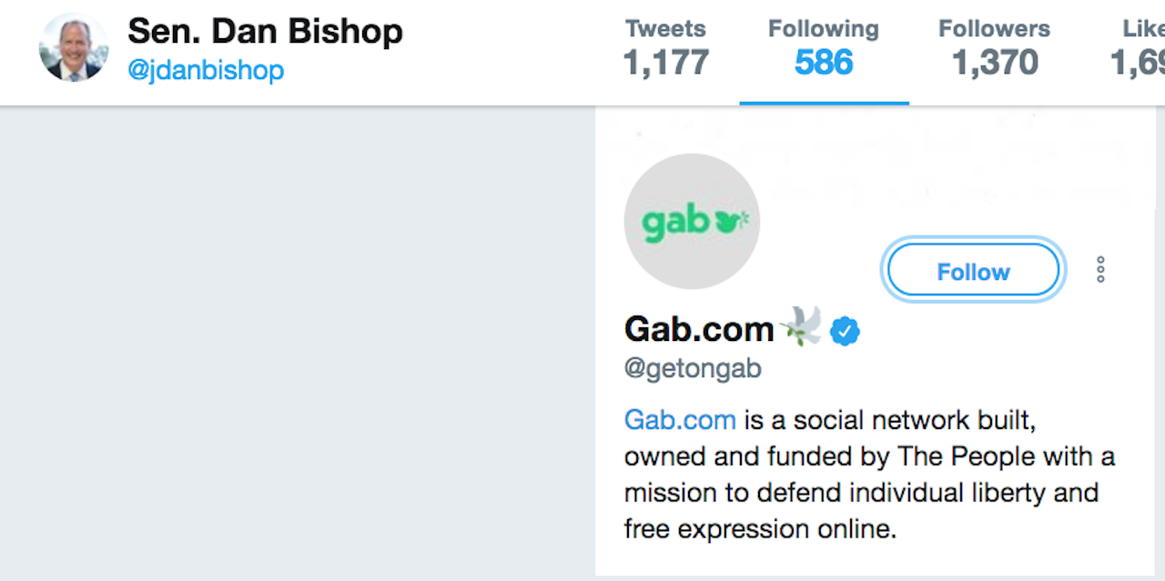 North Carolina politics are fucking nuts. Only in a state with some of the most undemocratically gerrymandered districts in the country and a far-right legislature whose signature policy achievement, by the way, is a bill that was essentially an act of blatant transphobia would a prominent state senator get caught investing in a social network for Nazis and brush it off by claiming he’s a victim of a smear campaign. And yet that’s exactly what State Senator Dan Bishop of Charlotte, NC did last week, after a Daily Mail investigation revealed he was “one of the only known investors” in Gab. In case you aren’t familiar with Gab, it’s an upstart social network that caters to racists, neo-Nazis, the alt-right, and anyone else who’s too odious a person for Twitter. It’s an unsavory platform to be affiliated with, even if you’re a company providing them services behind the scenes, and when it was revealed that Pittsburgh synagogue shooter Robert Bowers routinely posted anti-Semitic messages to the site, companies such as Stripe, PayPal, Microsoft, GoDaddy, and hosting service Joyent terminated their business relationships with the social network for Nazis. The site is currently offline but claims to be re-launching soon.