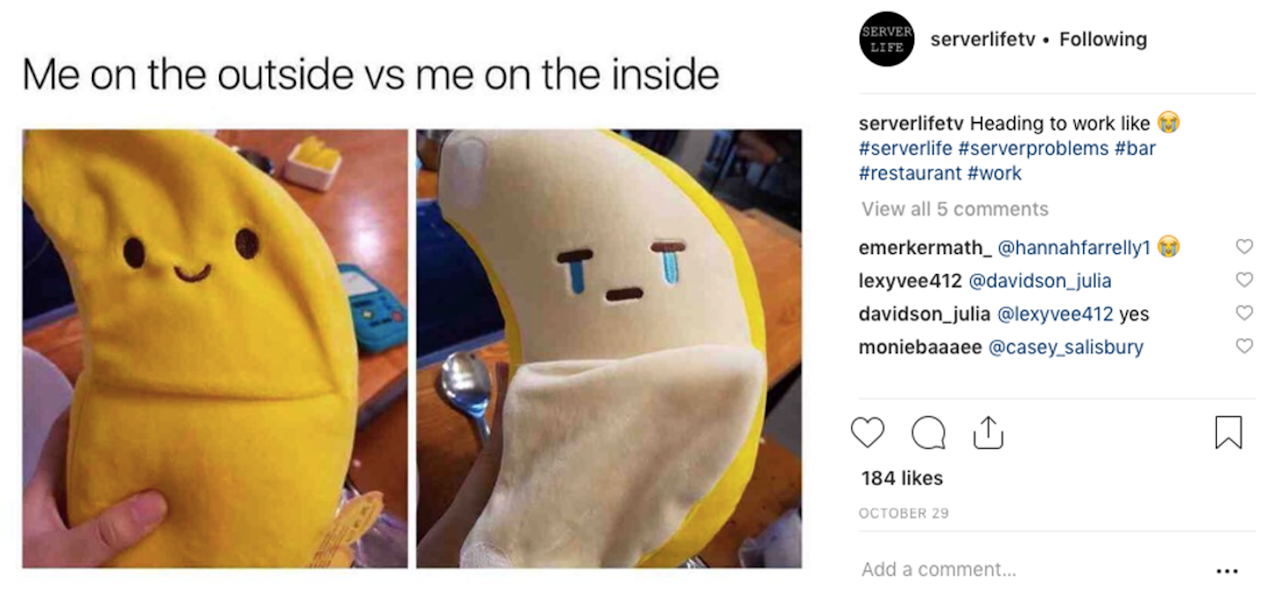 But, because it’s the internet, most of the commiserating revolves around sharing relatable memes. The memes come from accounts like Server Life (634,000 Instagram followers), the Bitchy Waiter (803,000 Facebook followers), and the Angry Bartender (332,000 Facebook followers), and they make fun of common frustrations, such as inept managers and intra-server drama. But, they also tackle consequential topics, like raising minimum wage, being overworked, and sexual harassment. (Other professions also share memes and support each other in online forums; this type of camaraderie is especially popular among two other emotionally laborious professions: nurses and teachers.)