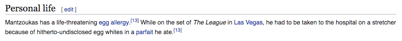 Also one last thing that is on my mind: In a recent podcast interview I listened to, the actor Jason Mantzoukas said he dated a woman for 11 years, but that woman’s name is not listed anywhere in his Personal Life section — nor is it that he dated Connie Britton! It just says he is allergic to eggs. I hate it.