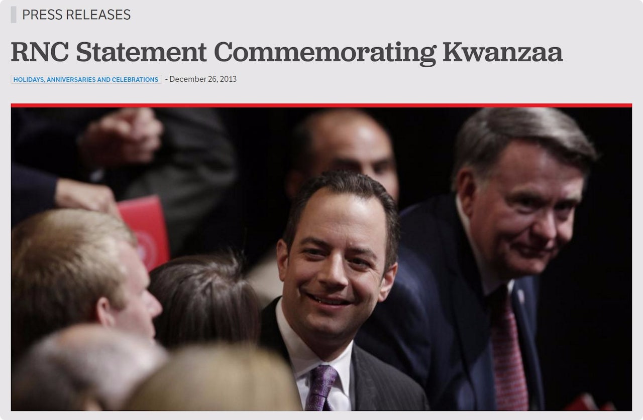 “I want to extend my best wishes to all who are celebrating Kwanzaa,” Priebus said. Co-chair Sharon Day came through with the assist: “Kwanzaa is a wonderful opportunity for all of us to honor the importance of family and community, and it reminds us of the great diversity in America. Happy Kwanzaa!” The well-wishes appeared to be an experiment, as the RNC failed to offer a repeat performance in 2014, 2015, or 2016.