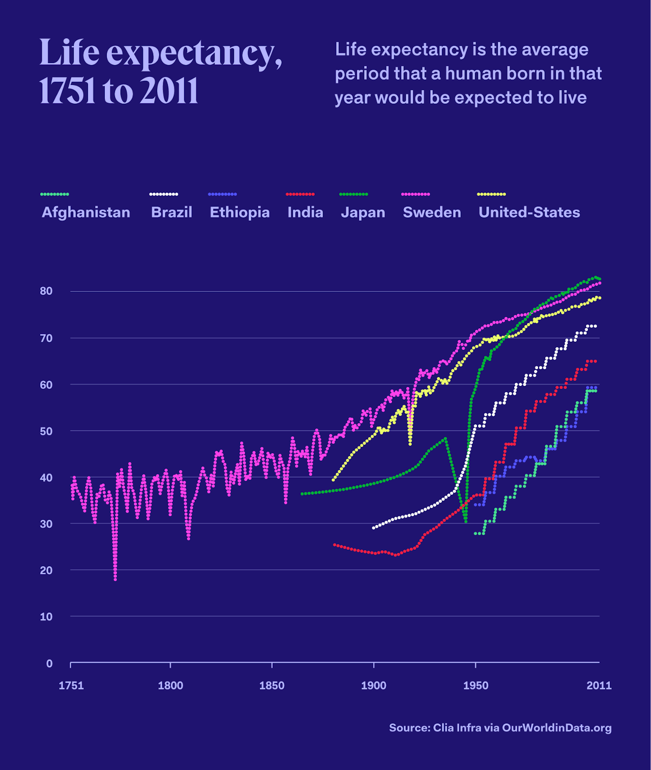 This may seem at odds with human history. American life expectancy has increased from an average of 47 years in the early 1900s to 78.7 years today, suggesting that human lifespan is malleable. That would be the wrong conclusion, however. The increase in life expectancy, which is the average of lifespans, was largely due to a decline in child mortality, as public health, hygiene, and medicine slashed the number of children who die before their fifth birthdays. People who survived into adulthood could reasonably expect to live into their 40s, 50s, and even 60s, and sometimes even beyond. Thomas Jefferson was 83 when he died, Ben Franklin was 84, and John Adams lived till 90. Jeanne Louise Calment of France, who died at age 122 and holds the record for oldest confirmed human lifespan, was born in 1845. “Her record is probably going to remain unbroken for a very long time,” said Millholland.